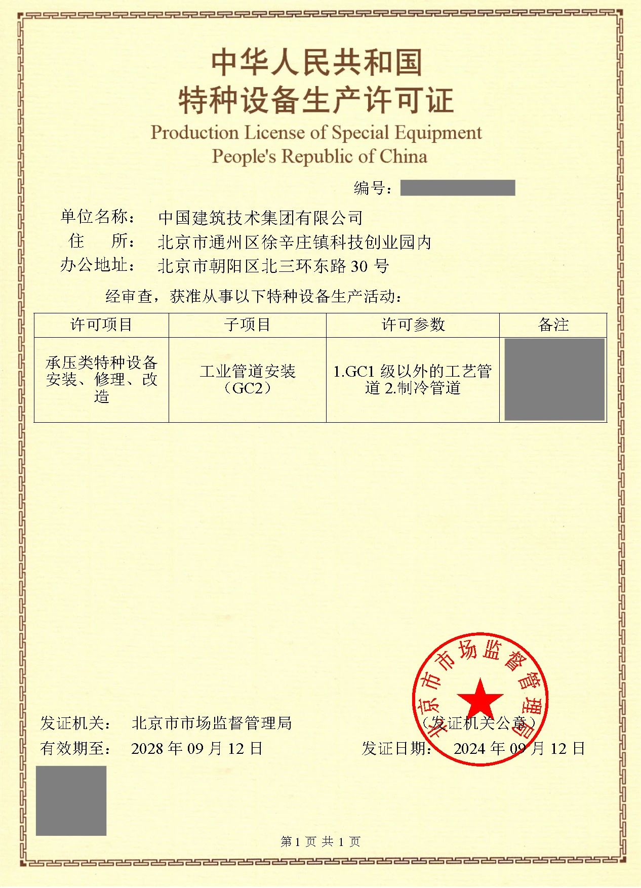 9月12日,经北京市市场监督管理局审核通过,beat365官方网站成功取得“特种设备(GC2级工业管道安装)生产许可证”。工业管道安装(GC2级)生产许可证主要适用于承压类特种设备的安装、修理和改造。