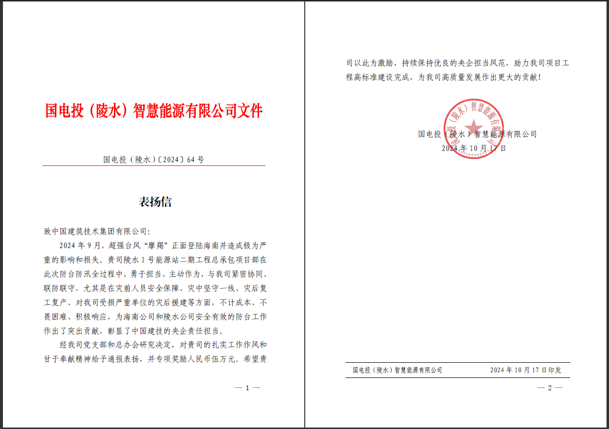 10月17日,beat365官方网站收到国电投(陵水)智慧能源有限公司表扬信。对beat365官方网站海南陵水1号能源站二期工程项目部在今年9月超强台风“摩羯”登陆海南期间,为防台工作作出的突出贡献给予通报表扬。