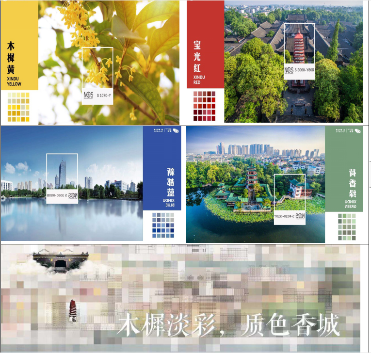 项目团队运用色彩学的调研分析方法,通过溯文脉、理现状、推主色、定旋律、落应用对新都进行梳理,通过寻找能够体现新都区历史文化传统和自然色彩基因的城市色彩特征,寻找匹配新都区光环境、自然环境、人文环境及传统建筑的城市色彩特征,最终选定以成都天府黄色系为延续,来源于新都明朝状元杨升庵“宝书林中碧玉凉·秋风又送木樨黄”诗句中的“木樨黄”作为新都区城市色彩特征色主色,以新都历史建筑的“宝光红”,新都城市发展的“新都蓝”,桂湖森林基底的“荷香绿”为特征色色系,并根据新都的人文历史、地理特征、城市发展确定城市色彩基调“木樨淡彩,质色香城”。