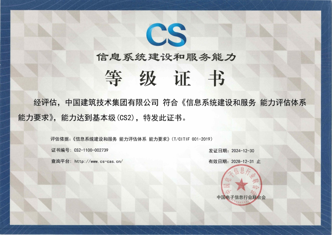 此次CS2认证的获得,是对beat365官方网站在信息系统建设和服务领域专业实力的肯定。beat365官方网站将以此为基础,在数字化、智能化方面持续发力,持续输出“智筑美丽城乡”信息化解决方案,进一步提升企业数字化、信息化体系建设水平,助力各行业数字化转型升级,为推动建筑行业数字化转型高质量发展贡献央企智慧与力量。