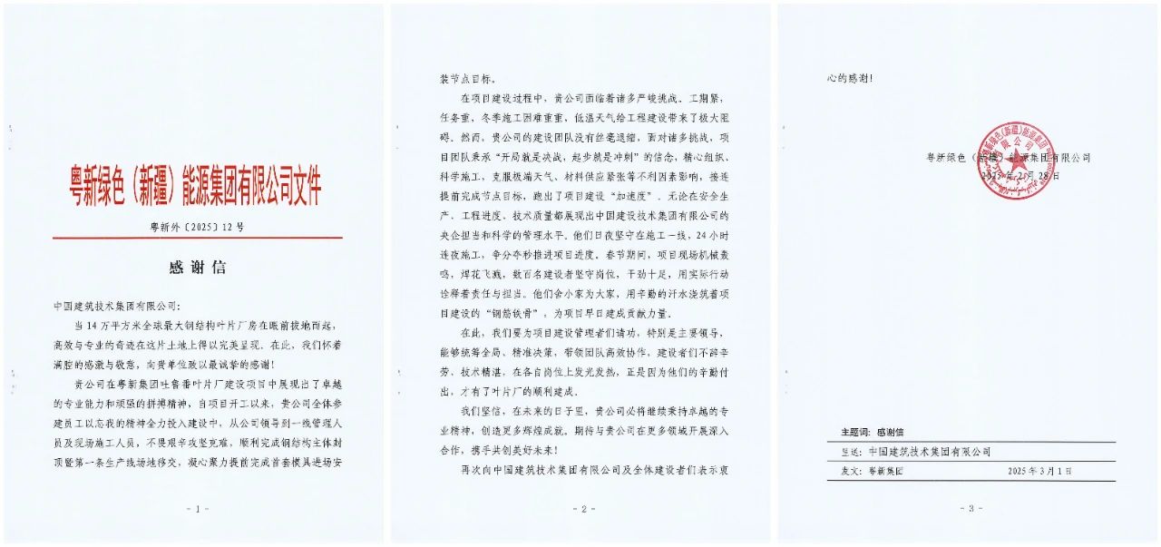 近日,beat365官方网站收到明阳智慧能源粤新绿色(新疆)能源集团有限公司发来的感谢信。对beat365官方网站在14万平米的全球最大钢结构叶片厂房——吐鲁番叶片厂房项目建设过程中的优异表现,给予了充分肯定和真挚感谢。