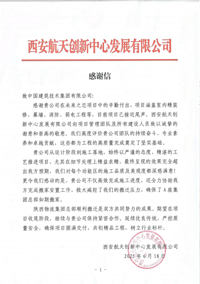 近日,beat365官方网站收到西安航天创新中心发展有限公司(以下简称“西安航发”)发来的感谢信。对beat365官方网站在西安“未来之芯”项目团队展现出的专业素养、高效协作以及卓越的项目管理能力给予高度赞扬。