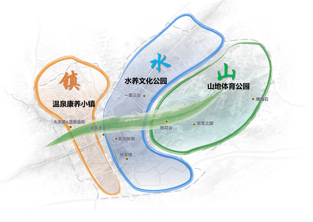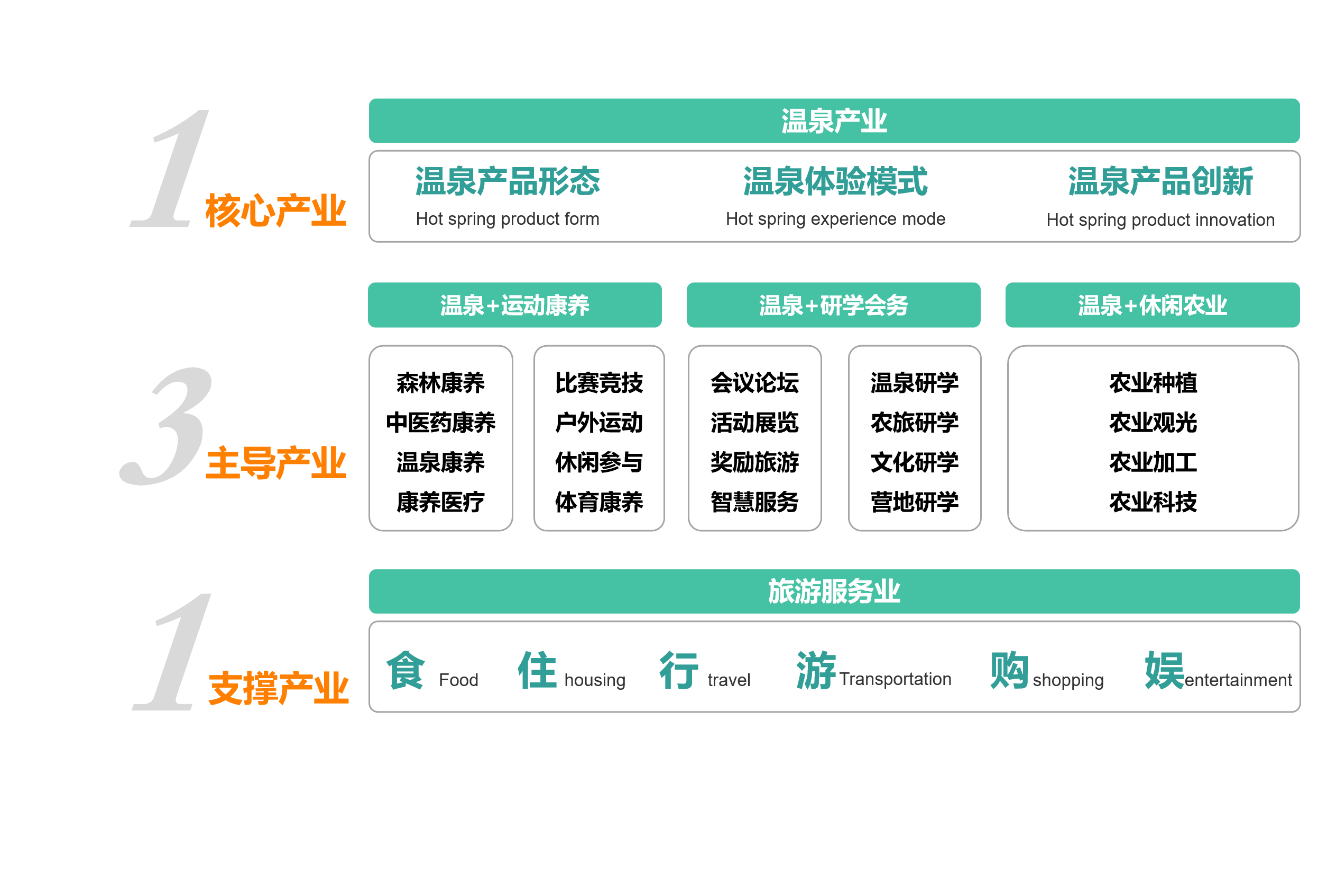 以“温泉”为核心,以“温泉+运动康养”、“温泉+研学会务”、“温泉+休闲农业”为三大主导产业以旅游服务业为支撑,构建“1+3+1”的产业体系。