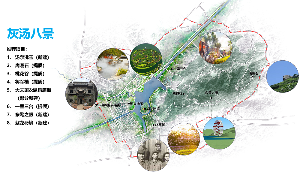 规划形成“两公园一小镇、八景点一通廊”的空间结构,以紫龙湖为核心打造温泉康养文化公园;结合东鹜山打造山地体育公园;结合灰汤镇区打造灰汤温泉民俗小镇;打“汤泉沸玉、鹰嘴石、桃花谷、将军楼、大夫第&温泉庙街、一里三台、东鹜之眼、紫龙秘境”灰汤八景;依托乌江、紫龙湖、东鹜山形成山水景观视线通廊。