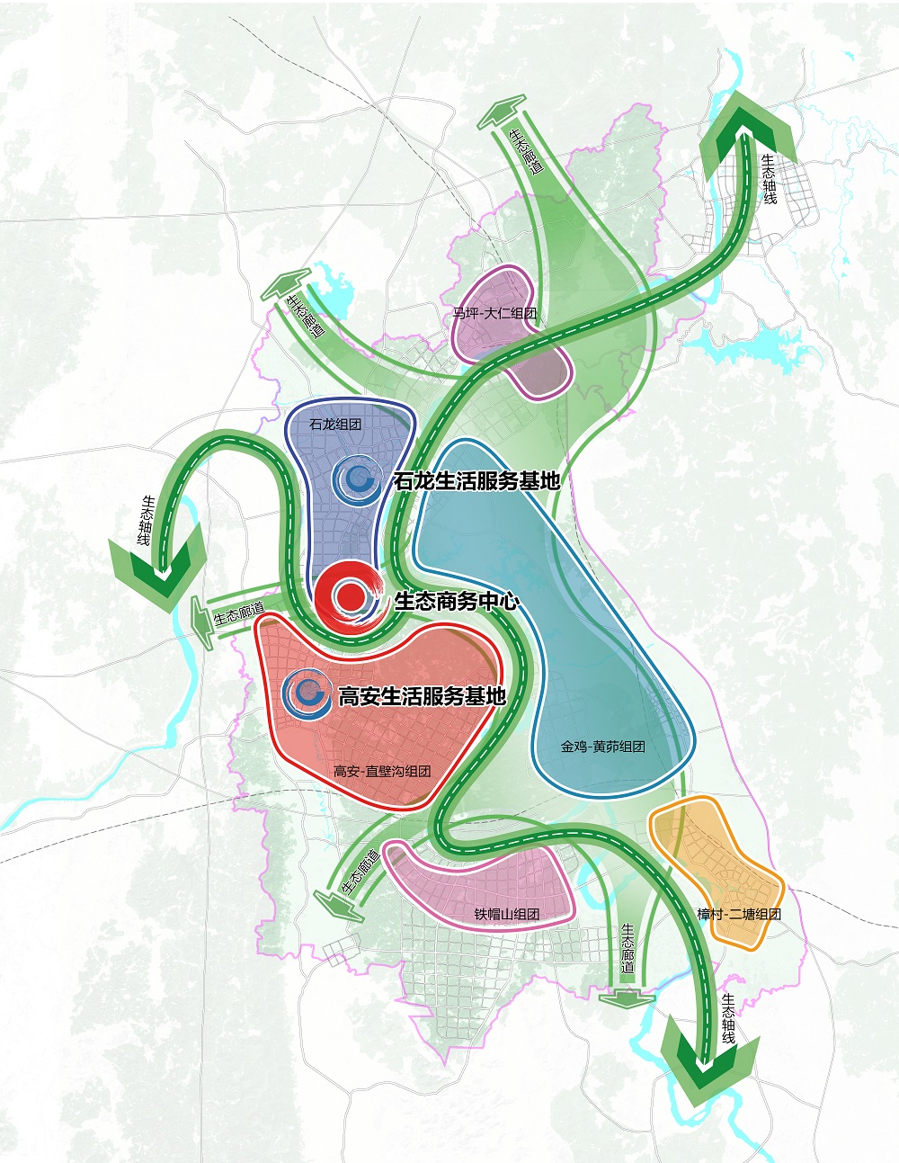 大开大合空间结构——着眼于自然生态特质,以水为脉、绿为基、路为廊形成大开的生态空间,以高度复合的产业功能组团形成大合的发展空间,构建一个中心、两大服务基地、三大生态轴线、五大生态廊道、六大组团的空间发展格局。