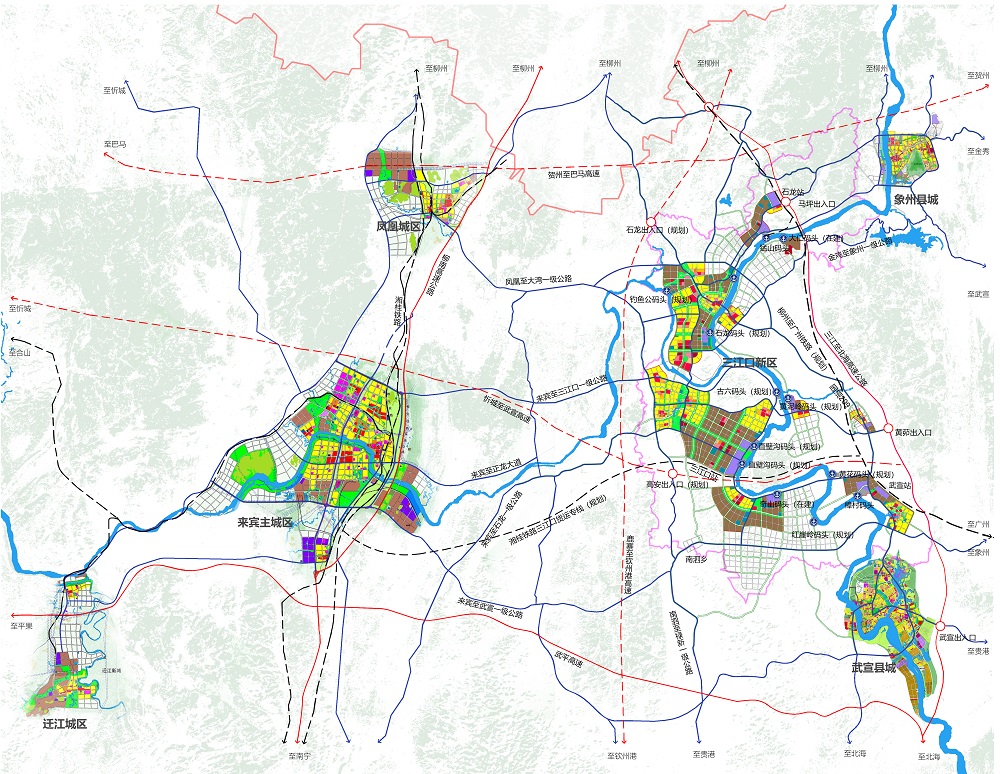 来宾市三江口港产城新区涉及的研究范围包括兴宾区的高安乡、南泗乡,象州县的石龙镇、马坪镇,武宣县的金鸡乡、黄茆镇、二塘镇等乡镇,规划新区研究范围655.35平方公里,规划范围131.43平方公里。规划高铁、港口、陆路多式联运对外互联互通与新区建设管理模式发展,助推来宾高质量发展,弥补广西发展短板。