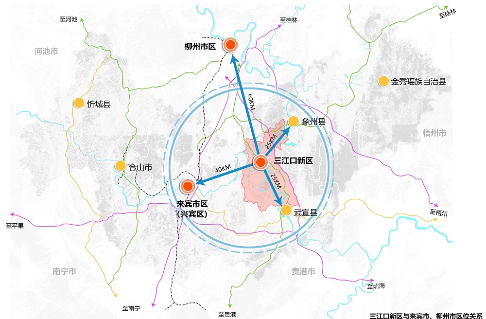 来宾市地处广西中部地区,紧邻柳州、南宁两大核心城市,北距柳州约65公里,西南距南宁约140公里,有“桂中腹地”之称。三江口新区位于来宾市东部,是桂中“金三角”核心,也是“西江黄金水道重要节点”和“南柳经济走廊重要节点”,区位优势明显。